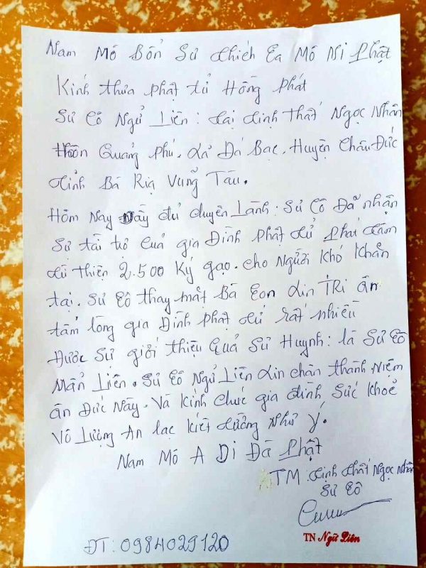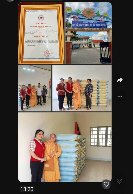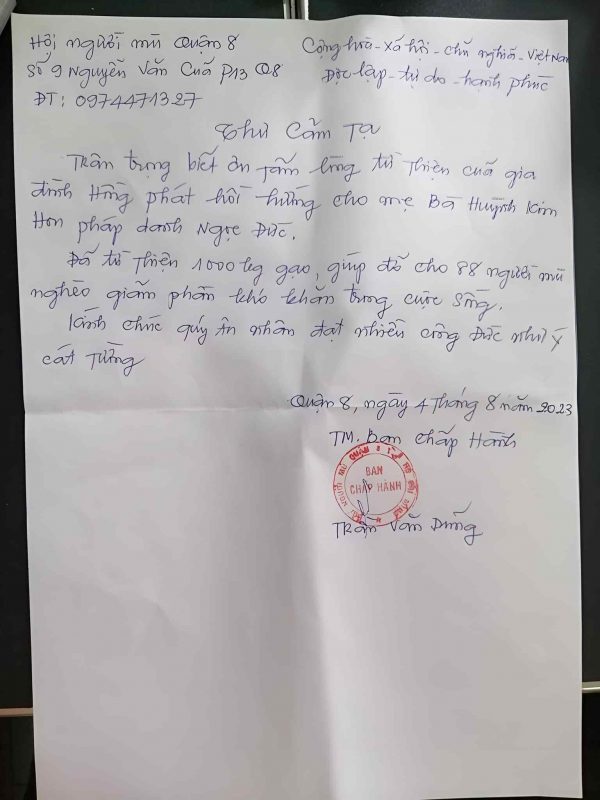 Hat Gao 0 Dong greatly appreciates and is thankful for the compassionate gesture of Hong Phat Family (USA) in donating 13 tons (13,000 kg) of quality rice to the people of Vietnam, as a dedication to Mother: Ms. Huynh Kim Hon, Dharma Name Ngoc Duc, who is 95 years old.